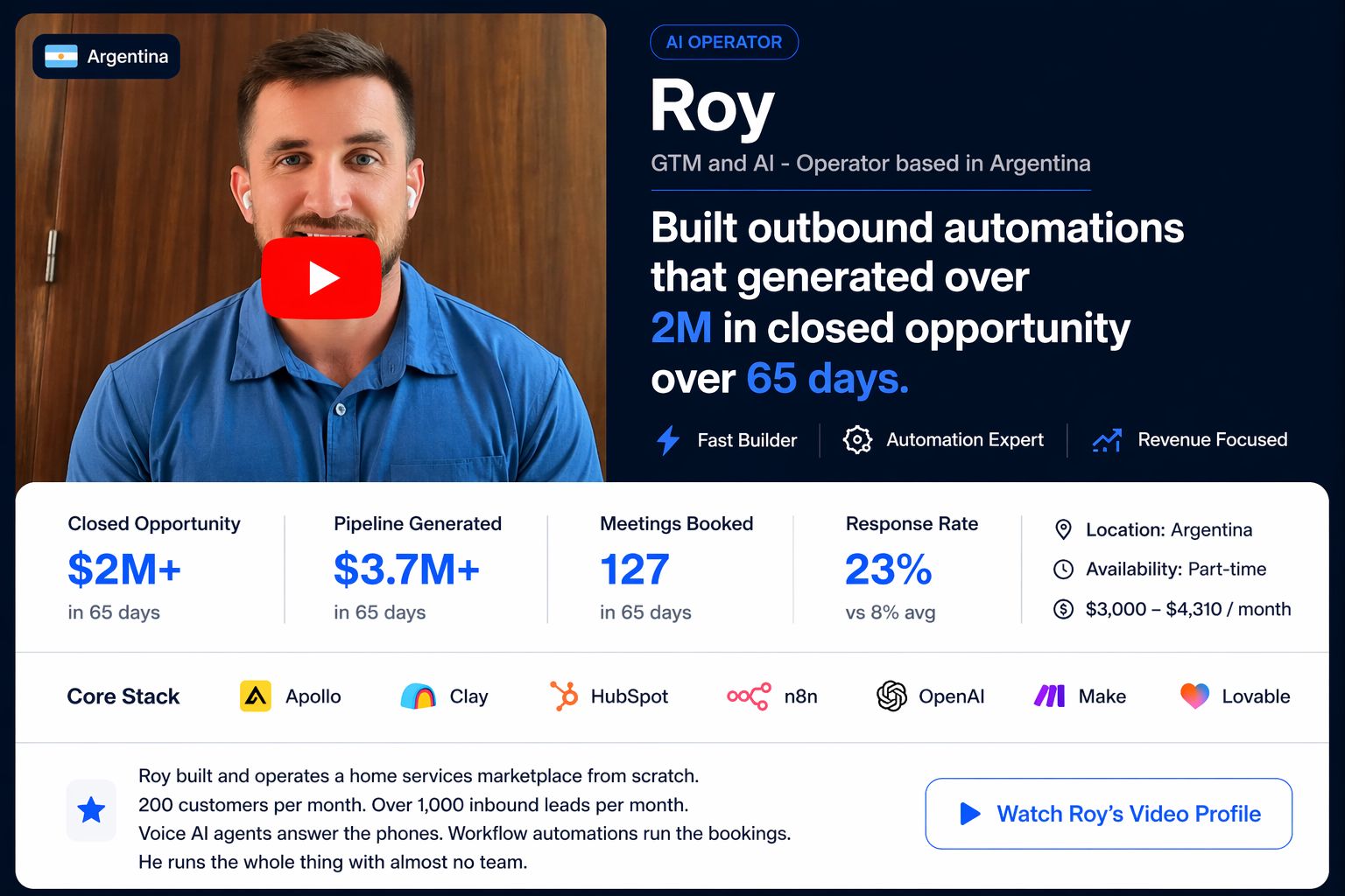 Roy built and operates a home services marketplace. 200 customers a month. Over a thousand inbound leads a month. Voice AI agents answer the phones. Workflow automations run the bookings.